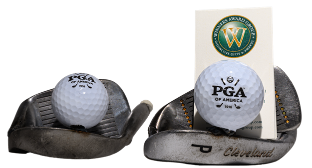 Now you can display your business cards with this custom card holder made from actual irons and a PGA logoed golf ball. Produced by our artist and sculptor, this unique holder will proudly display the official PGA logo with your latest business cards.Also makes a great tee gift for your club outings. Just $35 each.